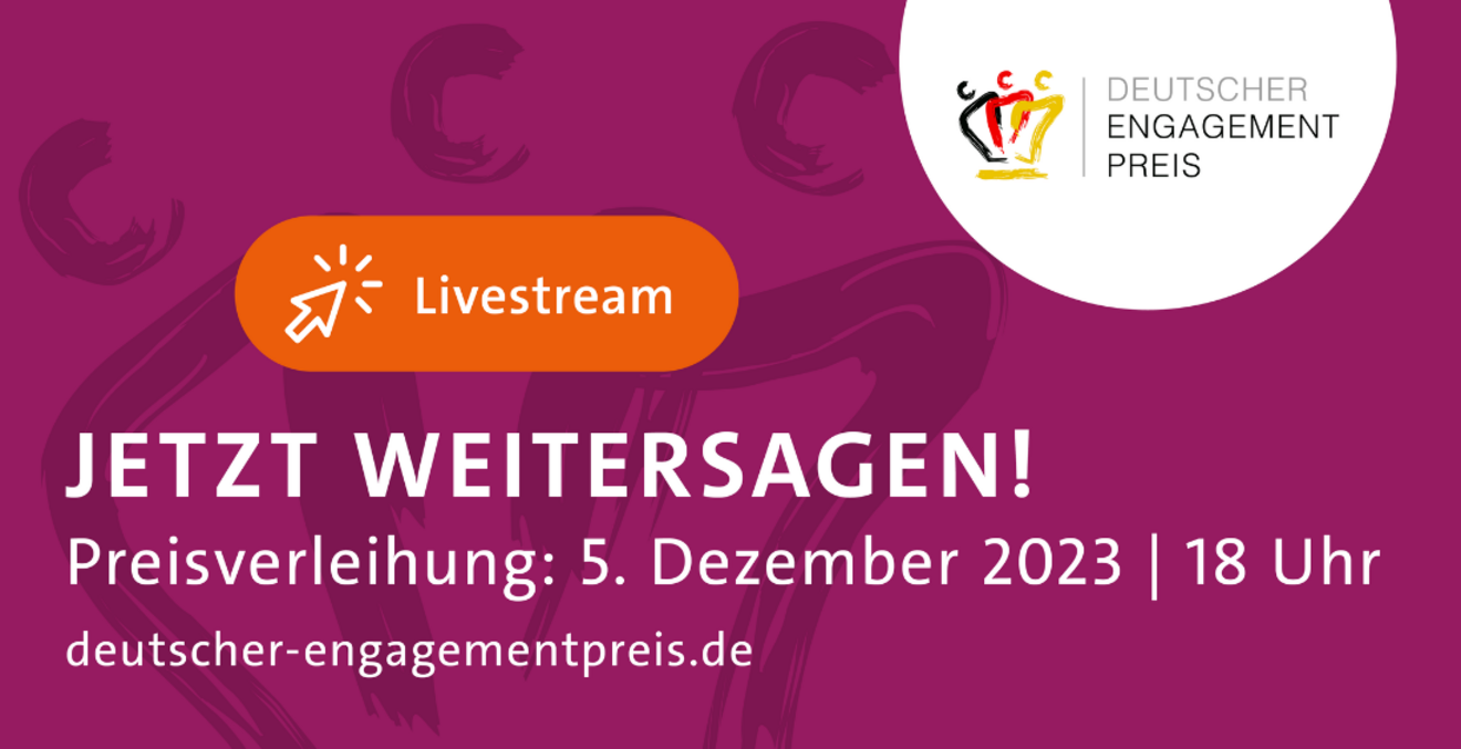 Am 5. Dezember, dem Internationalen Tag des Ehrenamtes, ist es soweit: Ab 18 Uhr wird der Deutsche Engagementpreis in Berlin verliehen und im Livestream auf unserer Website übertragen. Freuen Sie sich auf ein spannendes Programm und viele tolle Preisträger*innen! weiterlesen